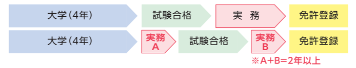 国土交通大臣が指定する建築に関する科目[指定科目]の単位を取得すれば,卒業後すぐに一級建築士の受験が可能です.免許登録にあたっては,大学卒業後2年間の実務経験を必要としますが,図のように,試験の前後に関わらず,免許登録の前までに実務経験を積んでいる必要があります.